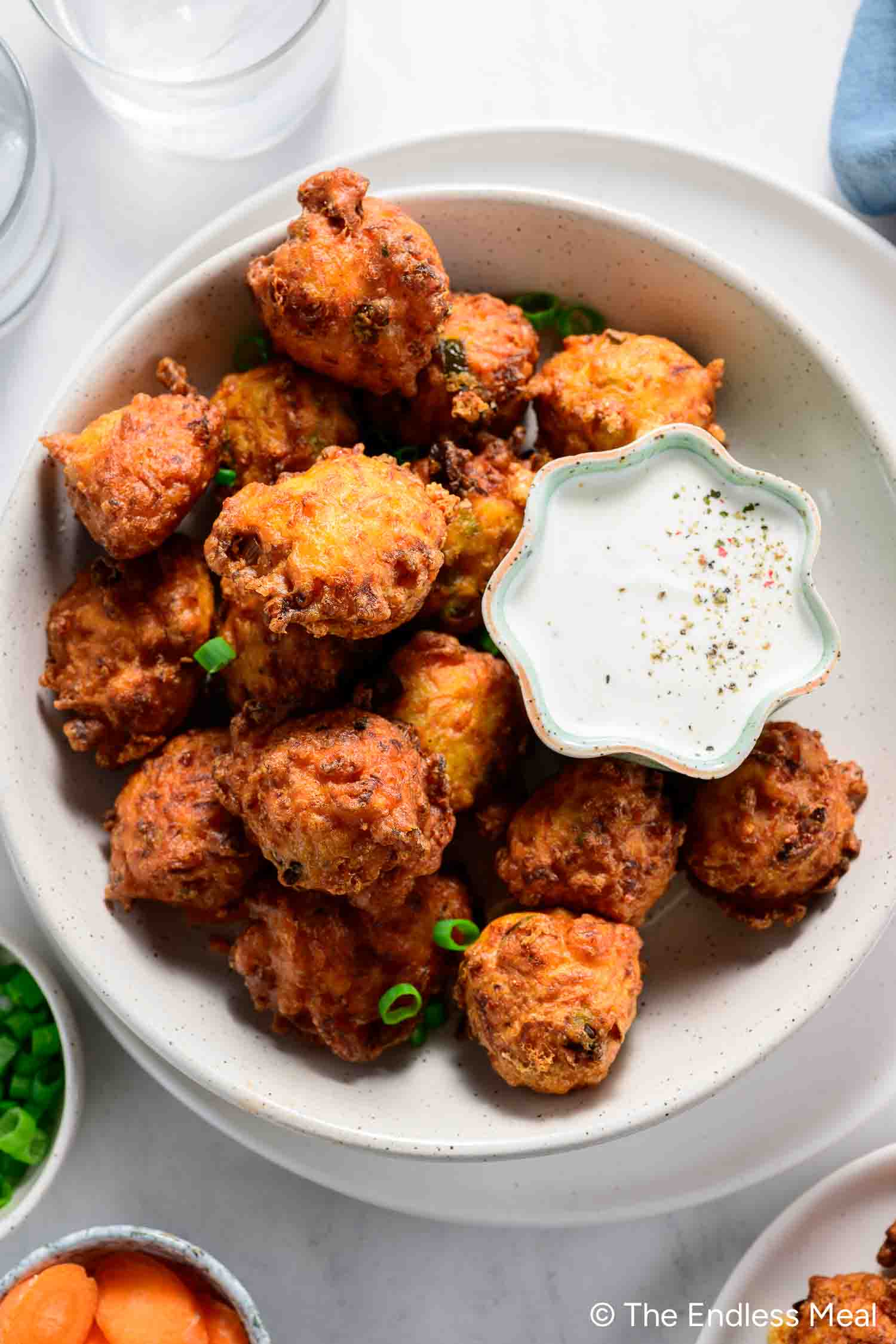 - Heat 2 inches of oil in a heavy pot over medium heat or in a deep fryer until it reaches 370 degrees Fahrenheit. Working in batches, carefully drop the batter by the spoonfuls (I like to use a medium-sized cookie scoop) into the hot oil and fry until golden, about 3 minutes, stirring a few times as they cook.